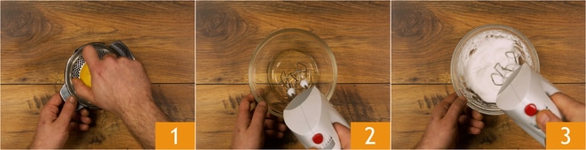 Pour réaliser la friture de calmars en pâte à frire, il faut d'abord presser le citron 1. À ce stade, cassez l'œuf et séparez le blanc du jaune dans deux bols différents. En utilisant un batteur électrique 2, montez les blancs en neige 3.