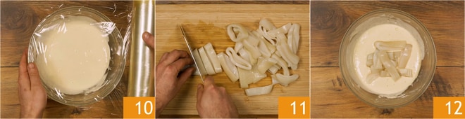 Couvrez avec du film plastique 10 et laissez reposer au réfrigérateur pendant 20 minutes. Prenez les calmars et coupez-les en anneaux épais d'environ 7 mm 11. Plongez-les dans la pâte 12.
