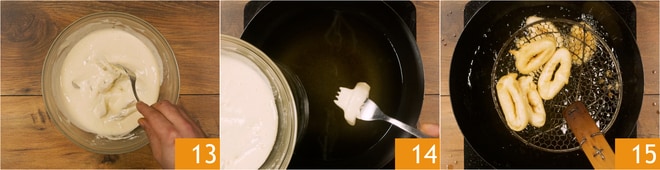 Mélangez bien pour recouvrir complètement les anneaux 13. Chauffez l'huile dans une grande casserole jusqu'à une température de 170°. À l'aide d'une fourchette, égouttez les calmars de l'excès de pâte et plongez-les dans l'huile chaude 14. Faites cuire pendant 2-3 minutes jusqu'à ce qu'ils soient bien dorés, puis égouttez-les de l'huile 15.