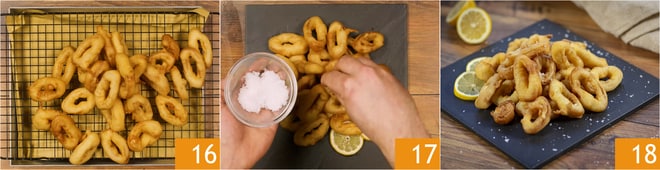 Transférez-les sur une grille avec du papier absorbant en dessous 16. Transférez-les dans une assiette, ajoutez des flocons de sel 17 et servez vos calmars en pâte frits 18.