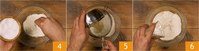 Dans un autre bol, versez la farine et ajoutez une pincée de sel 4 ; filtrez à l'intérieur le jus de citron 5 et ajoutez l'eau pétillante 6.