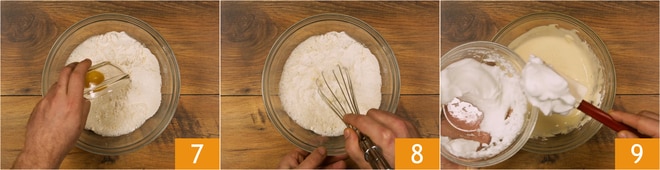 Ajoutez également le jaune d'œuf 7 et mélangez bien avec un fouet 8. Une fois que vous avez obtenu un mélange homogène, ajoutez aussi le blanc monté 9, en mélangeant délicatement avec une spatule 9.