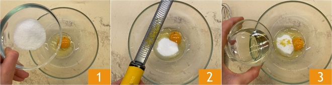 Pour préparer les beignets à la friteuse à air, dans un bol versez l'œuf, le sucre 1, le zeste de citron râpé 2 et l'huile 3.