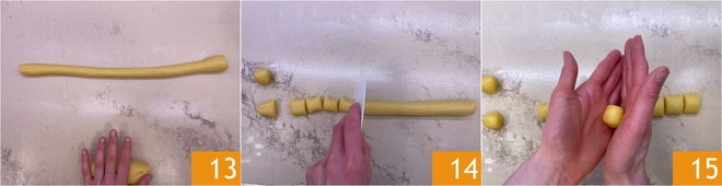Façonnez deux rouleaux longs 13 et coupez-les en morceaux pour obtenir environ 24 pièces 14. Formez des boules en les roulant rapidement entre les mains 15.