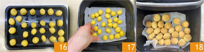 Une fois tous les beignets prêts 16, passez à la cuisson : placez une feuille de papier sulfurisé perforée dans le panier de la friteuse, déposez les boules 17 et faites cuire dans la friteuse à air à 180°C pendant 8 minutes, en les retournant à mi-cuisson. Ils doivent être légèrement dorés 18.