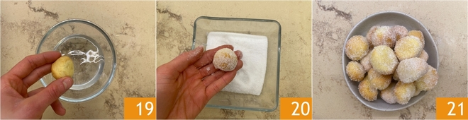 Une fois prêts, plongez-les rapidement dans l'eau 19 puis dans le sucre en poudre 20 : ainsi, même s'ils ne sont pas huilés comme avec la friture classique, le sucre adhérera facilement. Vos beignets à la friteuse à air sont prêts à être dégustés 21.
