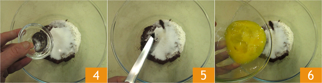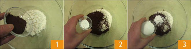 Pour préparer les castagnoles au chocolat, versez dans un grand bol la farine et le cacao 1, la levure 2 et le sucre 3.