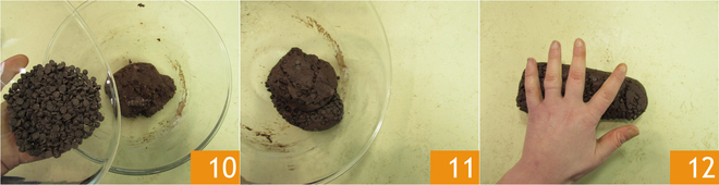 Incorporez enfin les pépites de chocolat 10. Pétrissez le tout, transférez le mélange sur un plan de travail 11 et formez un boudin 12.
