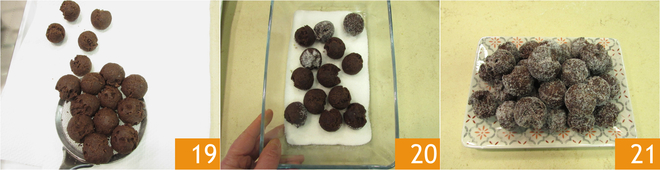 Au fur et à mesure que vous formez les boules, déposez-les sur un plateau 16. Avec ces doses, vous obtiendrez environ 40 castagnoles. Faites-les maintenant frire dans l'huile chaude à 170-175° (à mesurer avec un thermomètre de cuisine) pendant 2-3 minutes. N'oubliez pas de frire quelques pièces à la fois, pour ne pas faire baisser la température de l'huile 17. Égouttez avec une écumoire 18.