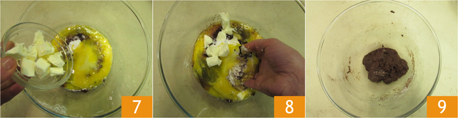 une pincée de sel et le beurre mou 7, pétrissez le tout avec les mains jusqu'à obtenir un mélange compact et homogène 9.