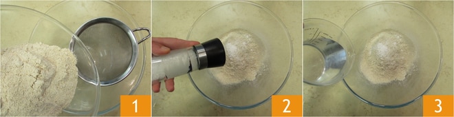 Pour préparer les beignets toscans, commencez par chauffer l'eau dans une petite casserole. Dans un grand bol, versez la farine de châtaignes 1 et une pincée de sel 2. L'eau doit être chaude mais non bouillante, versez-la doucement dans le bol 3 et remuez en même temps.