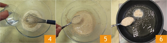 Vous devez continuer à mélanger pendant que vous versez l'eau 4 pour éviter la formation de grumeaux 5. Maintenant, chauffez l'huile de graines dans une poêle et, lorsqu'elle atteint environ 170°, plongez une cuillère à la fois de pâte en faisant très attention à ne pas vous brûler avec l'huile chaude 6.