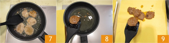 Faites frire pendant 2-3 minutes, puis retournez les beignets de l'autre côté 7 et cuisez encore 2-3 minutes. Égouttez-les 8 sur une assiette avec du papier absorbant de cuisine 9. Une fois que toute la pâte est utilisée, saupoudrez les beignets de châtaignes toscans de sucre à votre goût.