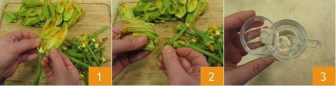 Pour préparer les beignets de sciurilli, nettoyez les fleurs en détachant le bouton de la tige, ouvrez les pétales et détachez-les de la corolle. Essayez de les garder intacts 1. Éliminez la tige avec le pédoncule, puis occupez-vous des pédoncules, c'est-à-dire les petites pointes à la base du bouton 2. Mettez de côté les fleurs nettoyées et préparez la pâte : dans un pichet avec de l’eau, versez la levure de boulanger 3.