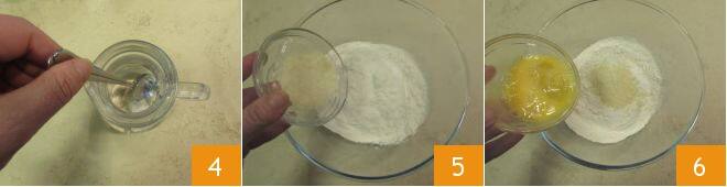 Dissolvez-la à l'aide d'une cuillère 4. Ensuite, dans un bol, versez la farine, le Parmigiano Reggiano AOP 5 et l'œuf 6.