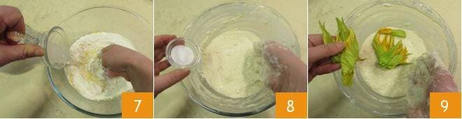 Commencez à pétrir avec les mains tout en versant également l'eau 7. Dès que la pâte aura pris consistance, ajoutez le sel 8. La consistance de la pâte sera assez molle et visqueuse, tandis que vous travaillez, "giflez-la" littéralement pour incorporer de l'air, avec des mouvements de bas en haut. Enfin, ajoutez les fleurs de courgette 9 et mélangez bien.