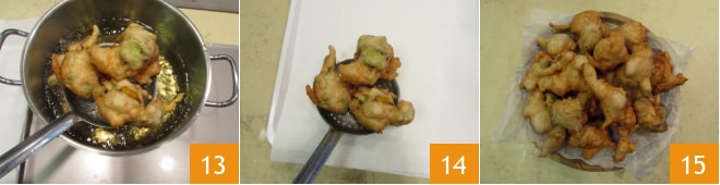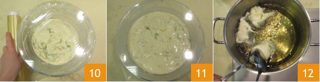 Couvrez le bol avec du film plastique 10 et laissez lever pendant au moins 2 heures ou jusqu'à ce que la pâte ait doublé de volume 11. Une fois le temps écoulé, portez l'huile de graines à 170° (mesurez avec un thermomètre de cuisine) puis versez 4-5 cuillerées de pâte dans l'huile bouillante et laissez dorer 12.