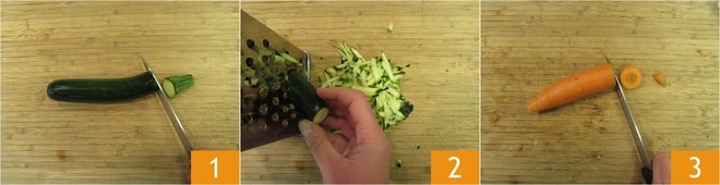 Pour préparer les beignets de légumes croustillants, commencez par laver soigneusement la courgette et la carotte. Retirez les extrémités de la courgette 1 et râpez-la avec une râpe à gros trous 2. Faites de même avec la carotte, en la préparant d'abord 3.