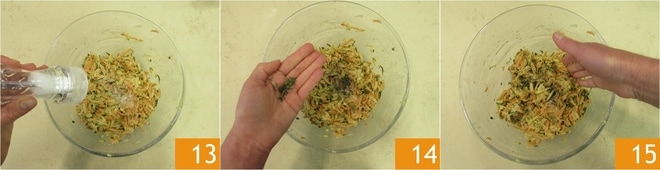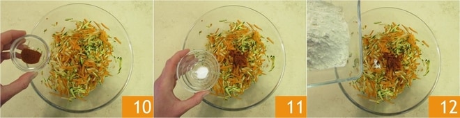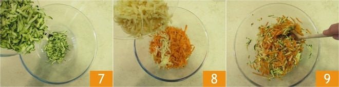 Dans un bol, versez les courgettes 7, les carottes et les pommes de terre 8. Mélangez bien le tout 9.