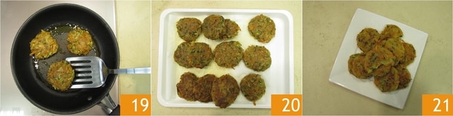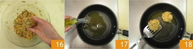 Formez des boules avec le mélange et aplatissez-les légèrement avec les mains 16, vous en obtiendrez 12 au total. Versez l'huile dans une poêle antiadhésive 17 et lorsqu'elle est chaude, déposez les beignets à l'intérieur 18. Si la poêle n'est pas assez grande, ne mettez pas trop de beignets et faites-les cuire en plusieurs fois.
