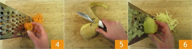 Ensuite, râpez-la 4. Épluchez la pomme de terre 5 et râpez-la 6.