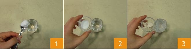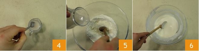 en utilisant une cuillère à café 4. Versez le tout petit à petit dans un bol où vous avez mis la farine et mélangez avec une cuillère en bois (5 et 6).