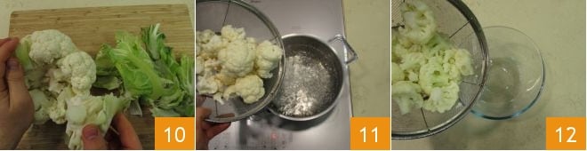Pendant ce temps, occupez-vous du chou-fleur. Éliminez les feuilles extérieures et la partie centrale à l'aide d'un petit couteau 10. Rincez bien les fleurs et plongez-les dans une casserole pleine d'eau bouillante et salée 11. Faites-les cuire pendant 10 minutes puis égouttez-les, tendres mais encore croquantes, dans un bol 12.
