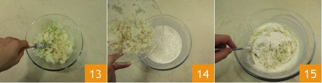 Écrasez-les grossièrement avec une fourchette 13 et laissez-les refroidir complètement avant de les plonger dans la pâte levée 14. Mélangez en essayant de ne pas trop dégonfler la pâte 15.