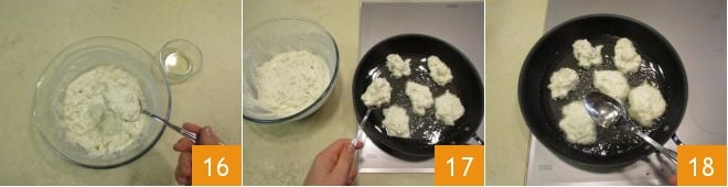 Trempez une cuillère dans l'huile de friture 16 puis cuisez 5-6 cuillerées de pâte en les plongeant dans la poêle avec quelques centimètres d'huile bien chaude (pas bouillante) 17. De temps en temps, arrosez les beignets avec l'huile chaude sur la surface de ceux qui ne sont pas encore prêts à être retournés 18.