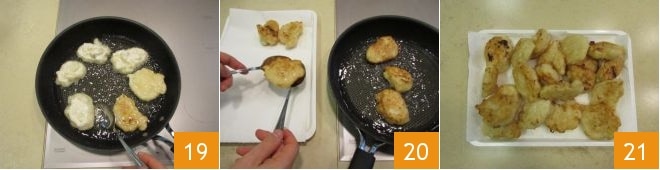 Après 3-4 minutes, retournez et poursuivez la cuisson pendant encore 2-3 minutes 19. Lorsqu'ils seront dorés des deux côtés, égouttez les beignets sur du papier absorbant 20 et continuez avec la cuisson de tous les autres 21.
