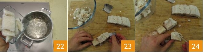 Enfin, passez à la préparation des beignets à la morue : nous avons utilisé celle déjà dessalée, sinon il suffira de la plonger dans l'eau pendant 3 jours en la changeant toutes les 12 heures. Coupez le poisson en morceaux et faites-le cuire pendant 15 minutes dans de l'eau non salée 22. Égouttez les morceaux puis enlevez la peau 23 et les éventuelles arêtes en les retirant avec une pince 24.
