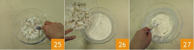Émiettez la morue avec une fourchette 25 puis plongez-la dans la pâte levée 26. Mélangez en veillant à ne pas trop dégonfler le mélange 27.