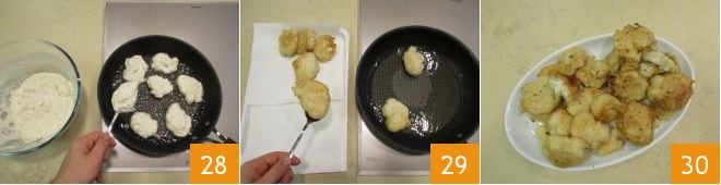 Dans une poêle avec quelques centimètres d'huile chaude, non bouillante, cuisez quelques cuillerées de pâte à la fois 28. Arrosez la surface qui n'est pas dans l'huile en récupérant cette dernière avec la cuillère et cuisez pendant 3-4 minutes. Puis, retournez et poursuivez la cuisson pendant encore 2-3 minutes 29. Au fur et à mesure, égouttez sur du papier absorbant et continuez ainsi avec la cuisson des beignets de morue et chou-fleur 30.