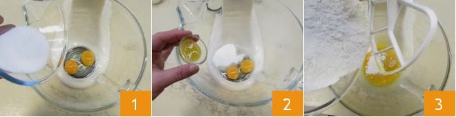 Pour préparer les beignets moelleux au four, commencez par la pâte : dans le bol d'un robot ménager équipé d'une feuille, versez les œufs et ajoutez le sucre 1, puis versez également le miel 2 et la farine tamisée 3