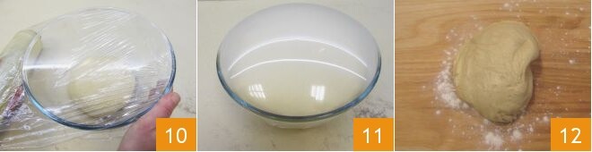Donnez une forme sphérique à la pâte et placez-la dans un bol légèrement huilé, couvrez de film plastique et laissez lever pendant 2 heures dans le four éteint avec la lumière allumée 10. Une fois le temps écoulé, la pâte aura doublé de volume 11 ; reprenez-la et placez-la sur un plan de travail légèrement fariné 12.