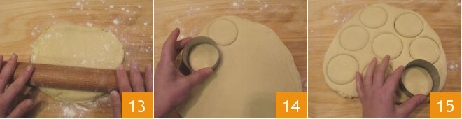 Étalez-la avec un rouleau à pâtisserie en un disque d'une épaisseur de 1 cm 13 ; avec un emporte-pièce de 7,5 cm de diamètre, découpez des disques (14-15)