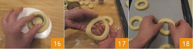 Détachez chaque disque et avec un emporte-pièce de 3,5 cm de diamètre, découpez-le pour créer le beignet avec le trou 16 ; puis élargissez-le légèrement avec vos mains 17 et placez chaque petit beignet sur une plaque tapissée de papier cuisson 18 en les espaçant bien les uns des autres (vous pouvez réutiliser la pâte restante, la laisser reposer environ 30 minutes, puis l'étaler à nouveau pour réaliser d'autres petits beignets).