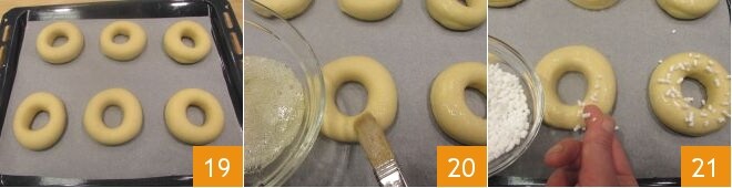 Laissez lever les petits beignets couverts de film plastique à température ambiante à l'abri des courants d'air ou toujours dans le four éteint avec la lumière allumée pendant au moins 1 heure : les petits beignets devront doubler de volume 19. Badigeonnez-les avec le blanc d'œuf 20 et saupoudrez-en certains de sucre en grains 21