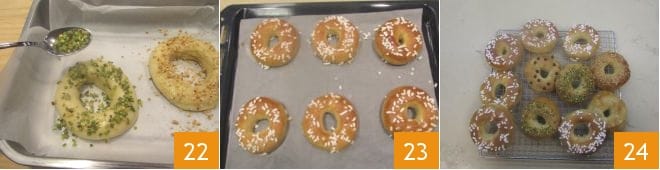 d'autres avec des noisettes ou pistaches 22 ; vous pouvez également utiliser des pépites de chocolat si vous préférez, en veillant à les fariner légèrement et à les congeler avant de les utiliser comme décoration. Enfournez les beignets dans un four statique préchauffé à 180° pour environ 15 minutes (160° pour 5-8 minutes si four ventilé, peut-être faites-en cuire un ou deux à l'essai pour mieux ajuster le temps). Une fois cuits 23, sortez-les du four et laissez refroidir les beignets moelleux sur une grille avant de les servir 24