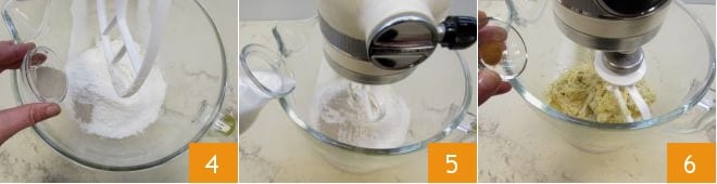 Ajoutez la levure de boulanger déshydratée 4 (vérifiez sur l'emballage s'il est nécessaire de la dissoudre dans un peu de liquide tiède avant de l'incorporer au reste des ingrédients, tandis que si vous utilisez de la levure fraîche, vous pouvez en prendre 12 g pour cette préparation à dissoudre dans un peu de lait tiède) ; puis versez également le lait à température ambiante en filet, tout en commençant à travailler la pâte 5. Ensuite, ajoutez la cannelle en poudre 6 et enfin une pincée de sel ; continuez à travailler les ingrédients jusqu'à ce que la pâte devienne homogène.