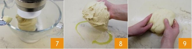 Remplacez la feuille par le crochet et pétrissez à nouveau ; lorsque le mélange sera enroulé autour du crochet, ajoutez un morceau de beurre mou à la fois en attendant qu'il soit absorbé avant de continuer avec un autre 7 ! Une fois tout le beurre absorbé, renversez la pâte sur un plan de travail légèrement huilé 8 et manipulez-la pendant quelques instants : elle devra être assez molle 9.