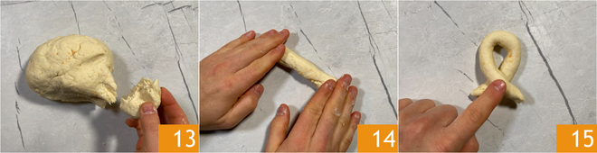Lorsque vous aurez obtenu une pâte douce et lisse, prélevez des portions de 40 g chacune 13 et formez des bâtonnets d'environ 20 cm de long 14. Croisez les extrémités du bâtonnet pour créer la forme d'un nœud, élargissez le trou avec les doigts et appuyez avec le doigt à l'endroit où les extrémités se chevauchent pour les faire adhérer 15. Disposez les graffes au fur et à mesure sur une feuille de papier sulfurisé ; avec ces quantités, vous en obtiendrez environ 20.