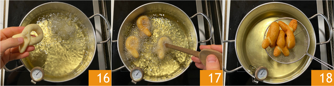 Vous êtes prêts à frire : chauffez l'huile de tournesol à 170°C et immergez quelques pièces à la fois, pour éviter que la température de l'huile ne baisse 16. Pendant la friture, aidez-vous de la pointe d'une cuillère en bois pour maintenir le centre ouvert, qui en gonflant, aura tendance à se refermer 17. Égouttez les graffes une fois qu'elles seront dorées uniformément, cela prendra quelques minutes 18.