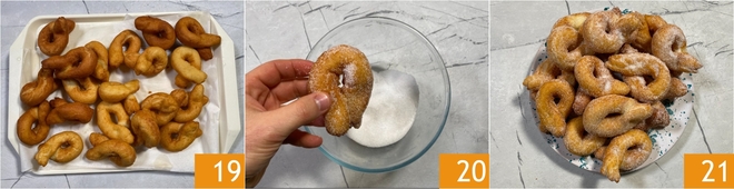 Transférez les graffes fraîchement frites sur du papier absorbant 19, puis passez-les dans le sucre en poudre tant qu'elles sont encore chaudes 20. Vos graffes sans levure et sans œufs sont prêtes à être dégustées 21 !