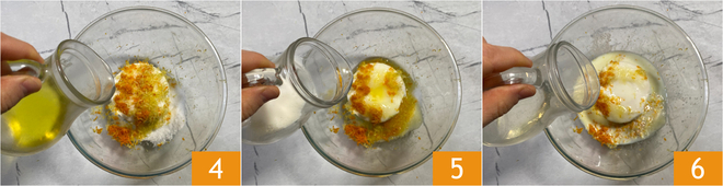 Versez la liqueur aux herbes 4, le lait 5 et l'huile de tournesol 6.