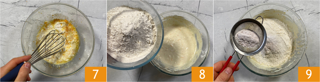 Mélangez avec un fouet 7, puis ajoutez la farine tamisée 8 et la levure 9.