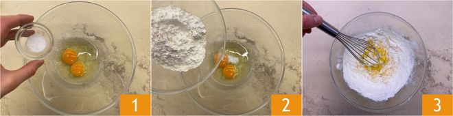 Pour préparer les benderniki, commencez par la pâte des crêpes : cassez les œufs dans un bol, puis ajoutez le sel 1, la farine 2 et mélangez avec le fouet 3.