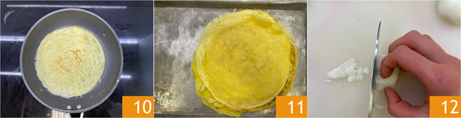 Poursuivez la cuisson de l'autre côté encore 1-2 minutes 10. Empilez les crêpes au fur et à mesure qu'elles sont cuites ; avec ces quantités, vous en obtiendrez 6 11. Mettez de côté et passez à la garniture : épluchez et hachez finement l'oignon 12.