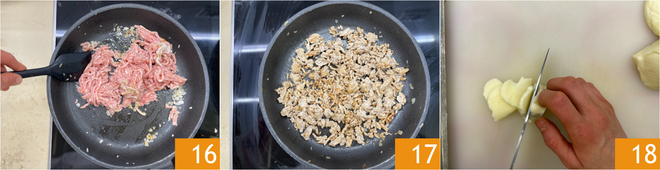 Faites cuire à feu moyen pendant une dizaine de minutes, en émiettant la viande avec une cuillère 16 jusqu'à ce qu'elle soit bien cuite 17. À ce stade, coupez le fromage en fines tranches 18.