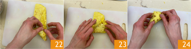 Repliez l'extrémité de la crêpe sur la garniture pour former un triangle 22 et continuez à replier le tout de cette façon jusqu'à atteindre l'autre extrémité 23. Enfin, insérez les bords à l'intérieur pour sceller le paquet 24. Répétez l'opération pour former 12 benderniki au total.